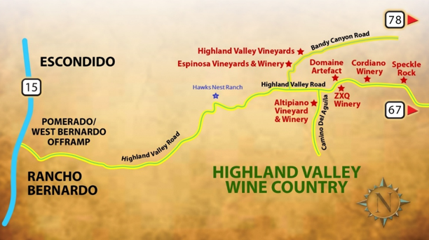 From the I15 freeway exit at Pomerado/West Bernardo Dr. Turn right onto Pomerado Rd and proceed .25 miles to the stoplight at Highland Valley Rd/Pomerado Rd and turn left onto Highland Valley Road. Proceed for 3 miles, Hawks Nest Ranch is the first left hand turnoff before you start climbing up the mountain and is marked by a wrought iron sign.